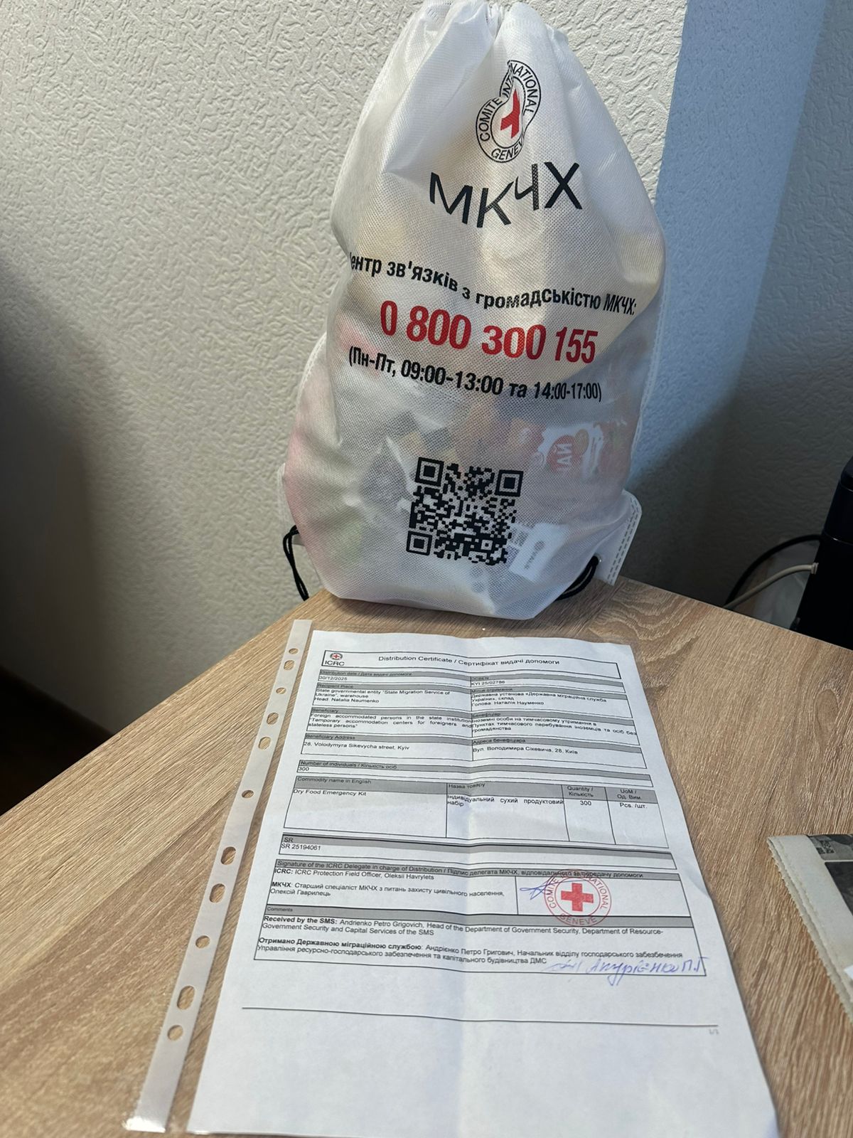 30 грудня 2025 року представники Державної міграційної служби України отримали ці продовольчі набори від Міжнародного Комітету Червоного Хреста. Найближчим часом вони будуть розподілені між територіальними органами ДМС з метою забезпечення належних умов утримання та транспортування іноземців та осіб без громадянства.