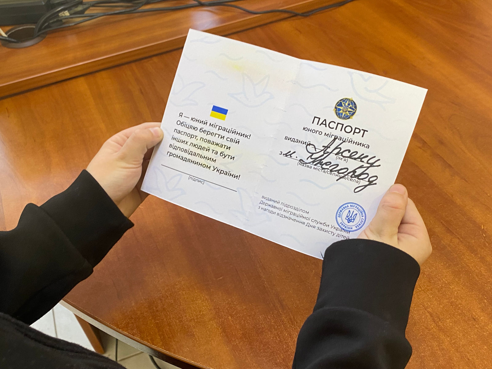 За старанність, допитливість і щирий інтерес до роботи колектив міграційної служби підготував для Арсена особливий подарунок — його перший символічний документ, «паспорт юного міграційника». Хлопчик прийняв його з тією гордістю, з якою дорослі отримують справжній документ, і навіть кілька разів перечитав, чи все правильно вписано, адже тепер точно знає – у роботі з документами помилок бути не може!